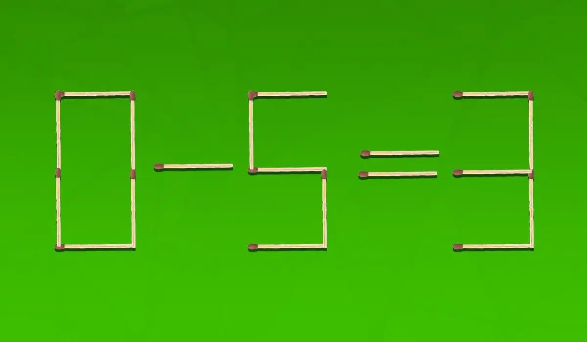 Предстои ви да поправите невярно равенство, съставено от клечки. Първоначалното уравнение 0 – 5 = 3 е грешно, но с преместването на само две клечки може да се превърне в математически вярно. Ключът е да промените числата, а не само знака.