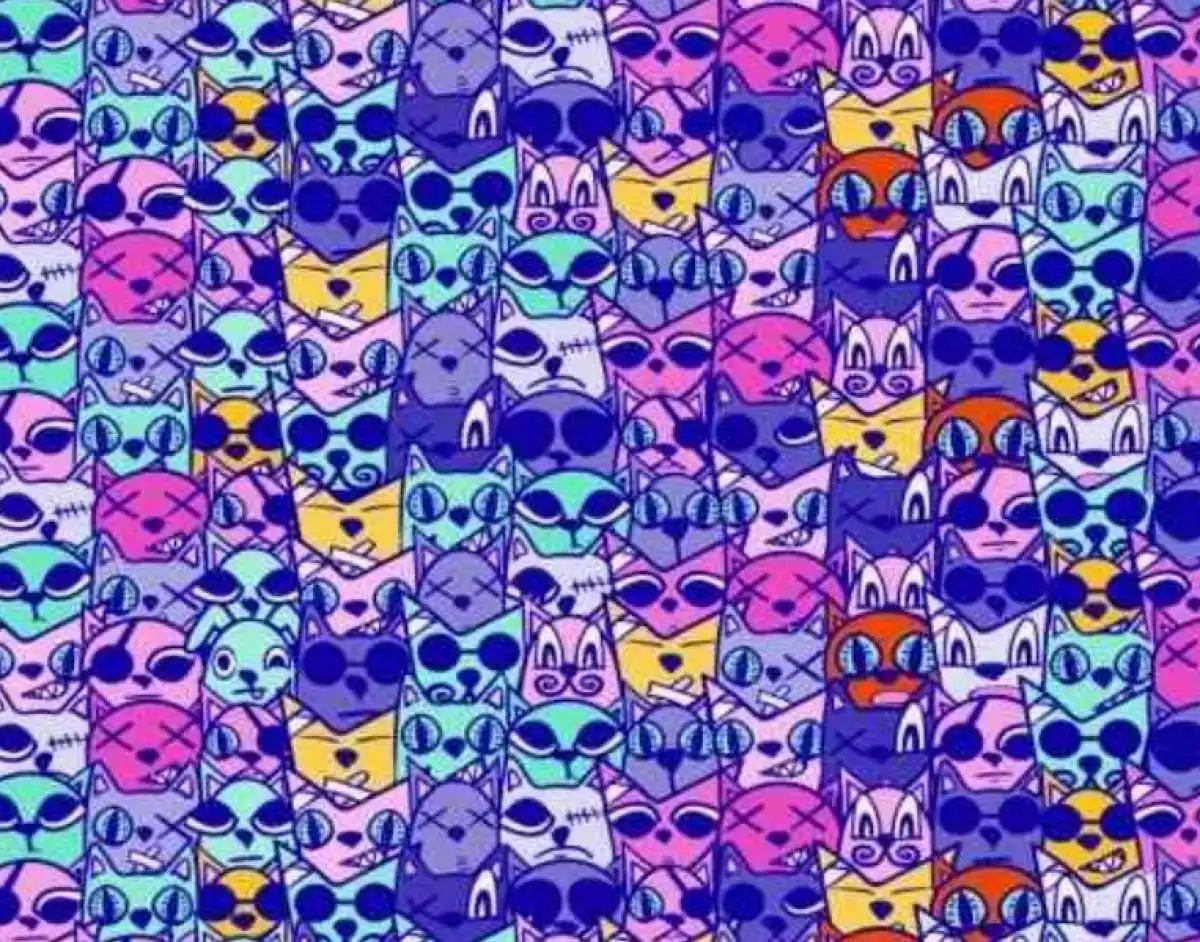 Този пъзел е истинско предизвикателство за зрението и концентрацията: сред море от повтарящи се изображения на котки се крие едно единствено куче. Ключът е да сканирате изображението системно, а не хаотично, за да не подпаднете на ошибката на възприятието, че всички фигури са еднакви.