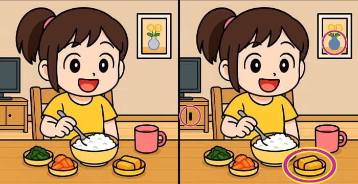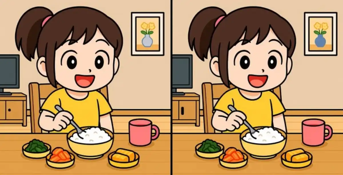 Този класически пъзел „Намери разликите“ с момиче на масата изглежда прост, но трите несъответствия са умело скрити, изискващи истинска внимателност и бързо сканиране на детайли. Ключът е да не се фокусираш само върху големите обекти, а да прегледаш и най-малките елементи в картинката.