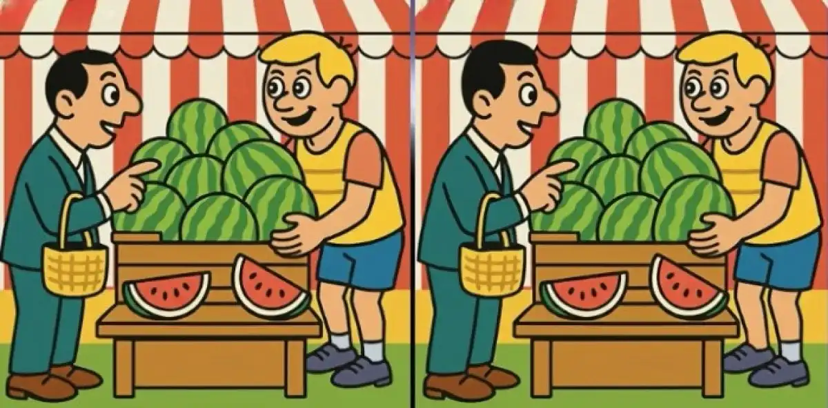 Този класически пъзел „Намери разликите“ те предизвиква да откриеш три несъответствия в две снимки на мъж, купуващ диня. Уловката е в детайлите – разликите са умишлено скрити в елементи, които мозъкът ти може да приеме за еднакви. За да успееш, трябва да изключиш автоматичното възприятие и да сканираш системно всяка част от изображението.