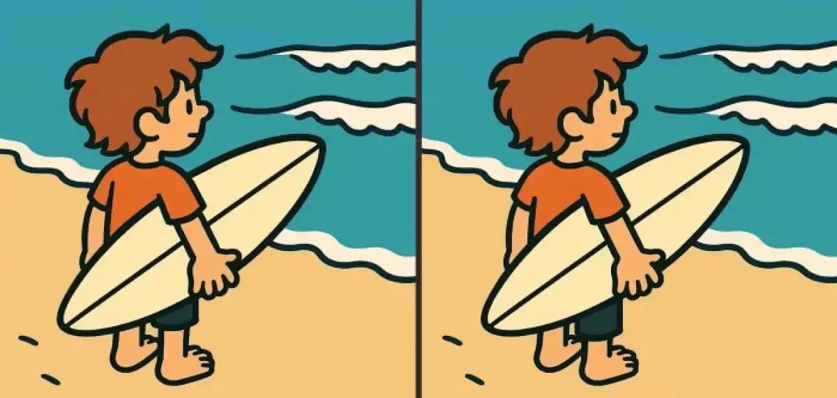 Предстои ви класически тест за наблюдателност: две почти идентични картини със сърфист, между които са скрити три малки разлики. Ключът към решението е систематично сканиране и фокус върху контурите и детайлите, а не върху цялостната картина.