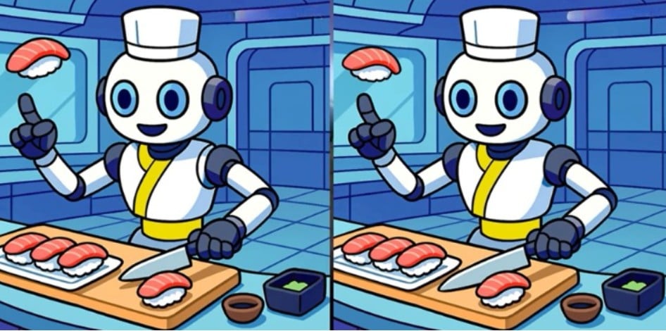 Този пъзел „Намери разликите“ тества окото и мозъка ви с една снимка на робот за суши. Двете картинки изглеждат идентични, но три детайла са променени. Уловката е в това да сканирате системно, а не да гледате хаотично.