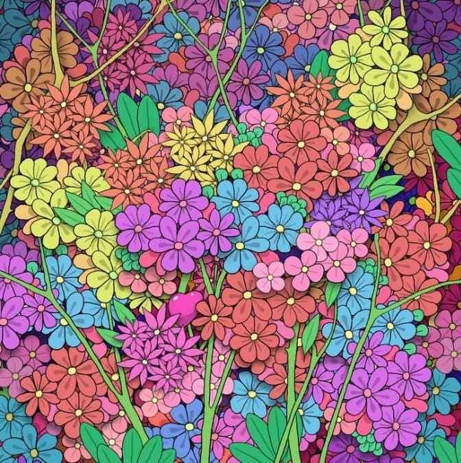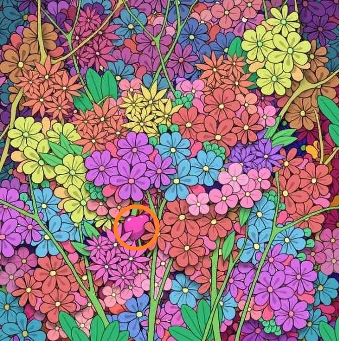 Сред ярките цветя и преливащите цветове се крие едно малко сърце. Задачата е да го откриете за 11 секунди, но уловката е в вниманието – цветовете и формите са подредени така, че да ви отклоняват. Ключът е да търсите не цвят, а паттерн и форма, които се различават.