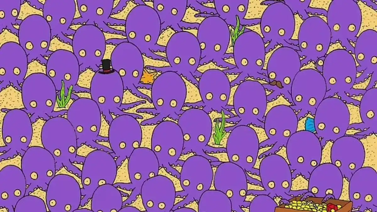 Този пъзел е истинско изпитание за вниманието и зрителната издръжливост. Сред нагъсто наредените октоподи се е скрила една риба, която се слива с тях поради сходни форми и цветове. Ключът е да сканирате изображението системно, а не хаотично.