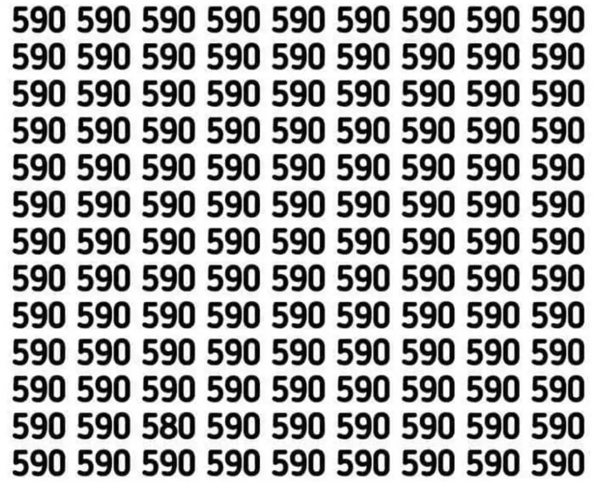 Този пъзел е класически тест за внимание и зрителна острота: сред море от повтарящи се числа 590, трябва да откриете единственото число 580. Уловката е в ошибката на възприятието – мозъкът ви очаква да вижда само „590“, което прави различното число трудно за забелязване.