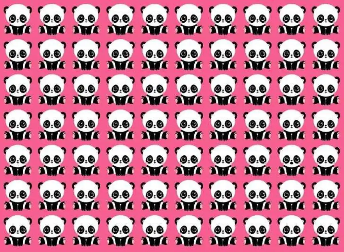 Сред множеството от еднакви панди се крие една, която се различава по един единствен детайл. Ключът към решението е да се откъснете от общото впечатление и да сканирате всяко лице поотделно, търсейки малката, но съществена аномалия.