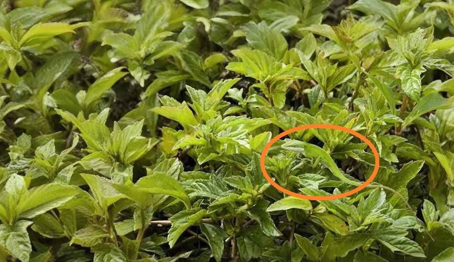 И ето и решението: Гущерът е скрит в долната дясна част на изображението. Той е свит и обърнат с главата наляво, като контурът на гърба и опашката му се сливат почти перфектно с венчелистчетата и стъблата на листата. Основният детайл, който го издава, е малко по-заострената и „суха“ текстура на кожата му в сравнение с меките листа. Вижте го отбелязан на следващата снимка.