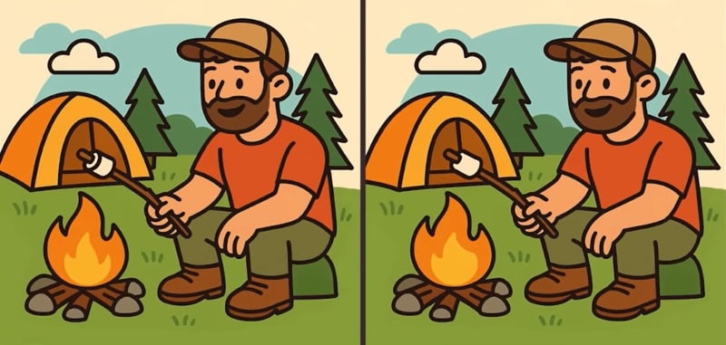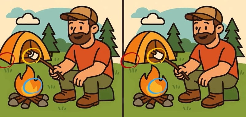 Този класически визуален тест „Намери разликите“ проверява вниманието ви до крайности. Две снимки на мъж, печещ маршмелоу, изглеждат идентични, но три малки детайла са променени. Ключът е да сканирате изображението системно, а не хаотично.