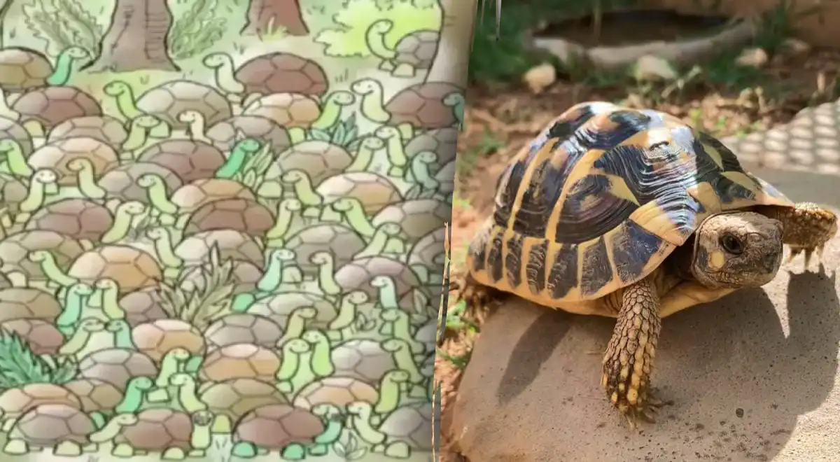 Готови ли сте за отговора? Змията се намира в долната лява част на изображението. Погледнете групата костенурки в този сектор. Виждате ли една „черупка“, която изглежда по-дълга и заострена в края? Това не е черупка. Това е тялото на змия, свито така, че да прилича на част от костенурка. Главата ѝ е обърната наляво и се слива с тъмните листа и сянката на земята. Основната грешка във възприятието тук е, че мозъкът ни автоматично категоризира всичко камбаненообразно и тъмно като „костенурка“, без да проверява формата задълбочено.