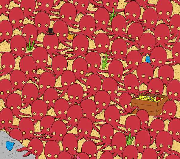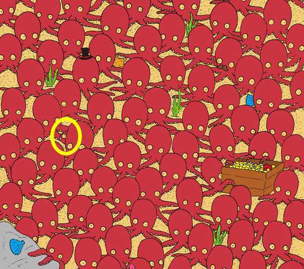 Погледнете изображението по-долу. Не бързайте веднага да търсите отговора. Опитайте се първо сами. Пуснете си часовника и се вгледайте. Пъзелите от този тип често разчитат на ошибка във възприятието – мозъкът ви очаква да види само октоподи, затова автоматично игнорира формата, която не отговаря на шаблона.