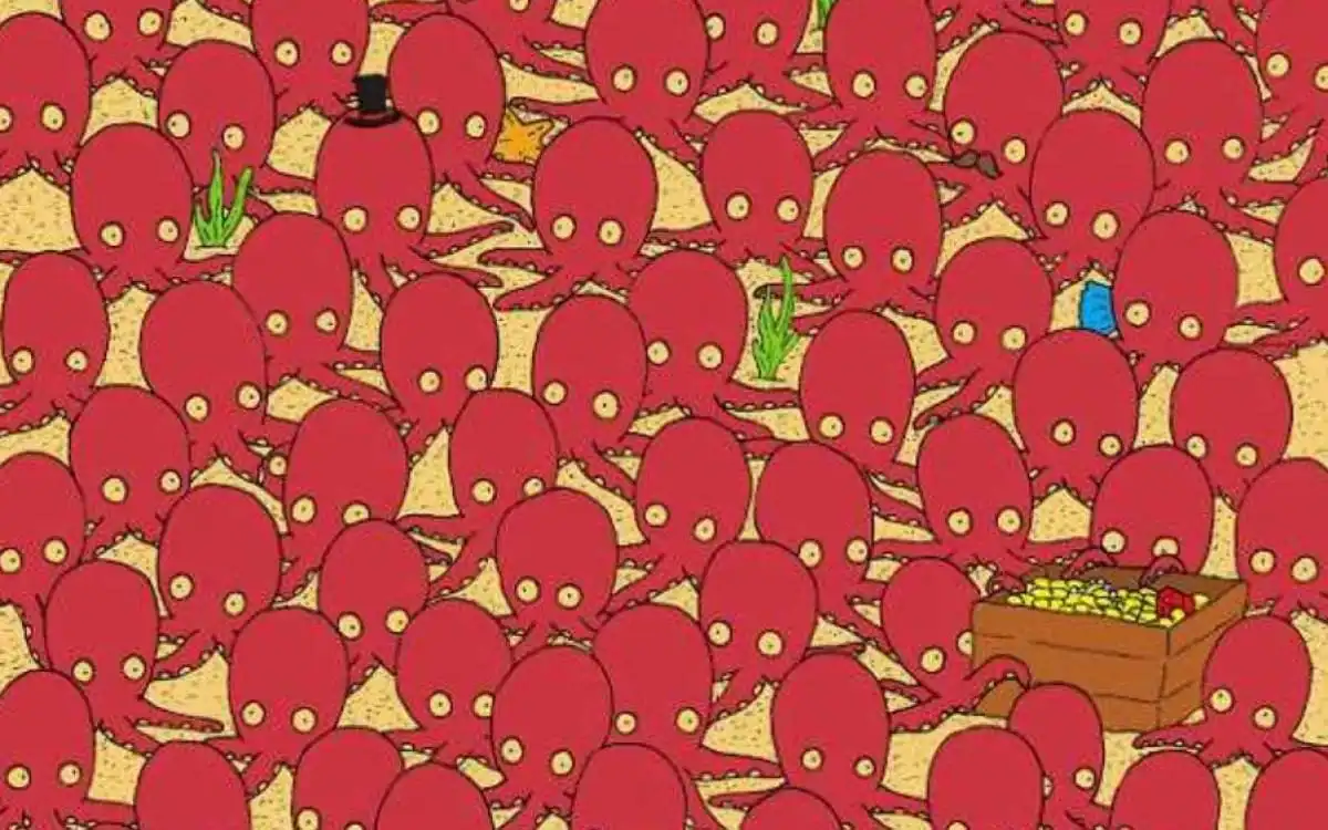 Представете си, че сте под водата и наблюдавате хаотична сцена. Десетки октоподи са се събрали около отворен съндък, пълен с блестящи монети и бижута. Всички те изглеждат еднакви – със завъртулки, пипала и кръгли очи. Вашата мисия е да намерите единствената риба, която се е промъкнала в тази тълпа. Времето ви е ограничено до 7 секунди, което прави задачата още по-вълнуваща. Готови ли сте да тествате вниманието си?