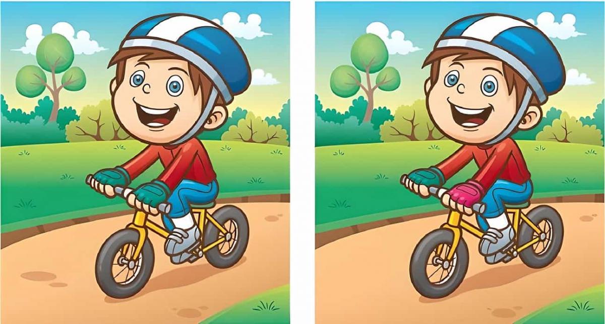 Представете си, че сте редактор на снимки и трябва да проверите два почти идентични кадъра за грешки. На разположение имате само 12 секунди. Това е точно предизвикателството тук. Двете идилични сцени с момче, което кара велосипед в парк, изглеждат като копия една на друга. Но това е само илюзия. Някъде в детайлите се крият четири разлики, които нарушават перфектното подобие.