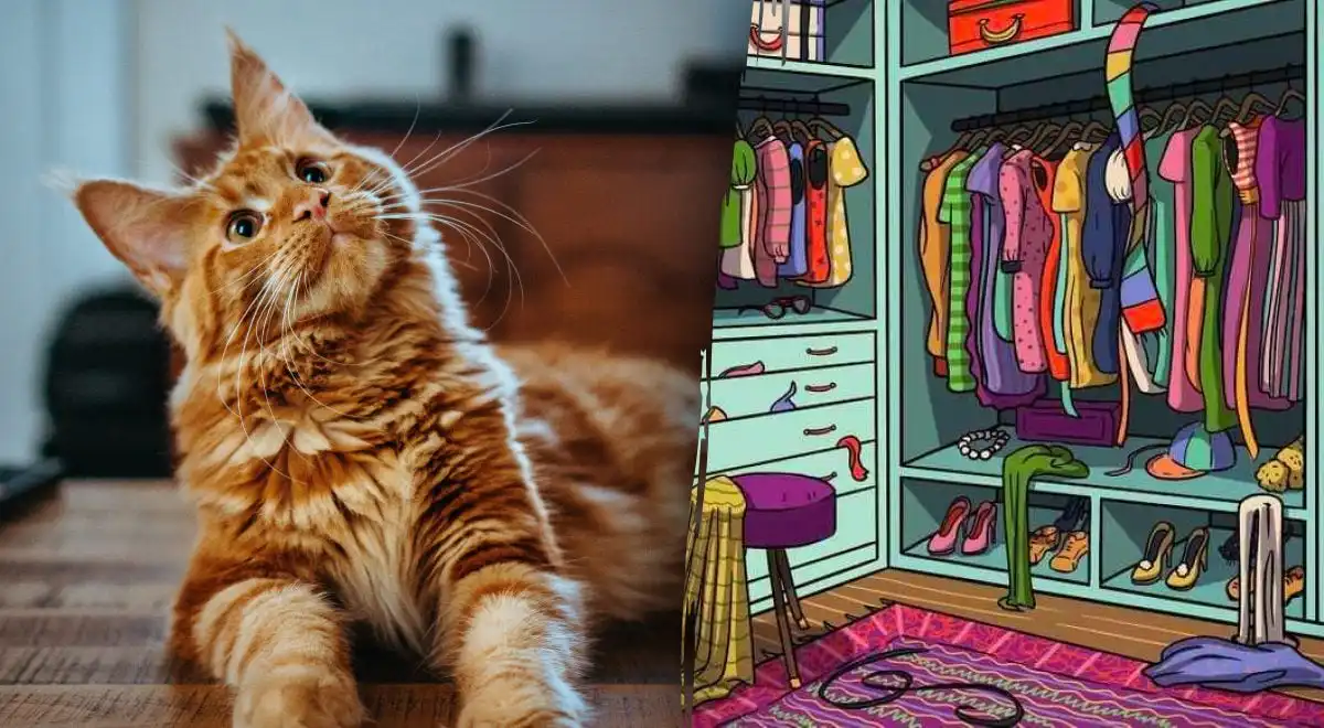 Ако все още се затруднявате, ето решението: Котката не е сред дрехите на рафтовете. Тя стои на пода в долния ляв ъгъл на гардероба, обърната с профила си към вас. Главата ѝ, с характерните за котка изправени уши, се слива с тъмния фон на отворената част на гардероба и сребристите отблясъци. Тялото ѝ е скрито зад вертикалната дъска на гардероба. Уловката е, че окото ни е привлечено от безпорядъка на рафтовете, докато решението е в по-спокойната, тъмна зона. Това е чиста ошибка на възприятието – търсим сложност там, където отговорът е по-прост.