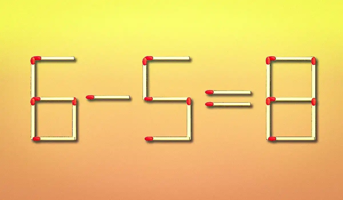 Това е класически пъзел с клечки, който изисква бързо и нестандартно мислене. Грешното равенство 6-5=8 трябва да се поправи с преместването на само една клечка. Ключът е да погледнете на числата не като статични символи, а като форми, които могат да се променят.