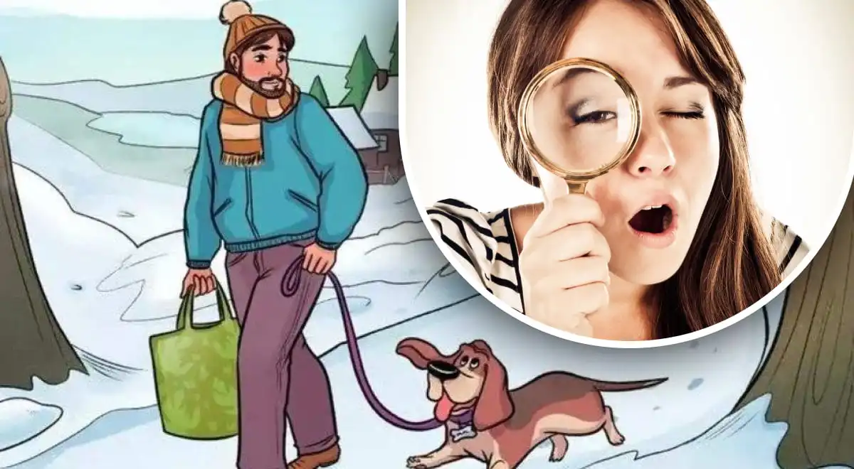 Представете си, че сте в заснежена гора. Въздухът е чист и хладен, наоколо е тихо. Виждате мъж, който се разхожда спокойно с кучето си. Кучето е на каишка, стопанинът държи зелена чанта. Всичко изглежда нормално и спокойно. Но нещо в тази картина не е наред. Задачата ви е да го откриете само за 5 секунди. Това е предизвикателство за вашата наблюдателност и способност да анализирате сцената извън рамките на обичайното.