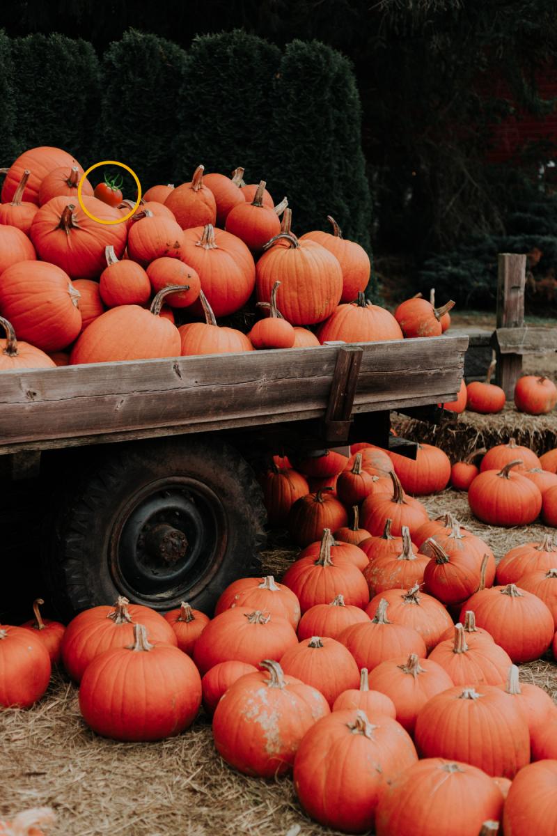 Представете си, че сте в селски двор в разгара на есента. Реколтата от тикви е събрана и подредена – някои са натоварени на ремарке, други са разпръснати по земята. Но точно преди да започне разпределението, фермерът си спомня, че сред оранжевите и зеленикави плодове е изпуснал един домат, който трябва да отиде в кошницата за сос. Сега трябва да го намерите, преди всичко да се разкара! Имате само 8 секунди, за да сканирате картината и да откриете „шпионина“. Това е тест не само за внимание, но и за способността да забелязвате аномалии в еднородна среда.