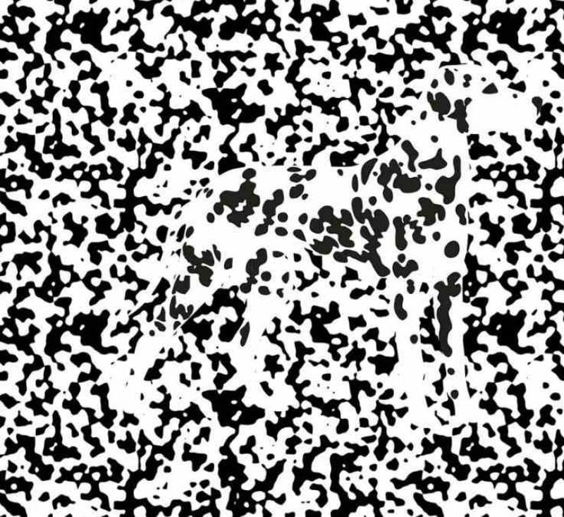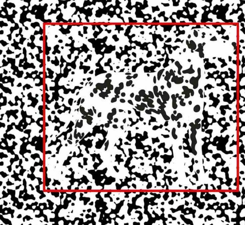 Това е класическа оптична илюзия, където хаотични черни и бели точки скриват силуета на куче. Ключът е да се откъснете от детайлите и да търсите цялостната форма, като разфокусирате погледа си или погледнете картинката от разстояние.