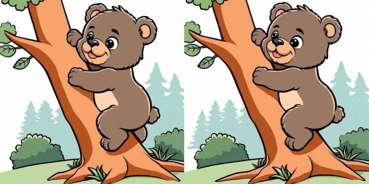 Този пъзел проверява вашето внимание към детайлите: на две на пръв поглед еднакви снимки на мече, катерещо се по дърво, се крият три малки, но ясни разлики. Ключът е да сканирате изображението системно, а не хаотично.