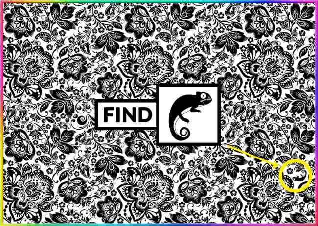 Това е класическа тест за внимателност: хамелеон, перфектно се сливащ с цветовете на едно украшение, се крие на снимката. Задачата ви е да го откриете за по-малко от 7 секунди. Ключът е да сканирате изображението не като цяло, а да търсите несъвършенства в текстурата и формата.