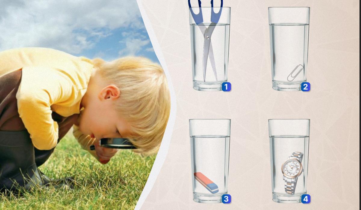 Представете си, че сте в лаборатория и пред вас са подредени четири еднакви чаши, пълни с вода. Във всяка от тях сте поставили различен предмет от бюрото си: ножици, щипка за хартия, ластик и ръчен часовник. Задачата звучи просто: за по-малко от 8 секунди определете в коя чаша има най-много вода. На пръв поглед всички чаши изглеждат пълни до ръба, но внимателният наблюдател ще забележи разлики в нивата. Тук не става въпрос за оптична илюзия, а за чиста физика. Можете ли да намерите отговора, преди да прочетете подсказките?