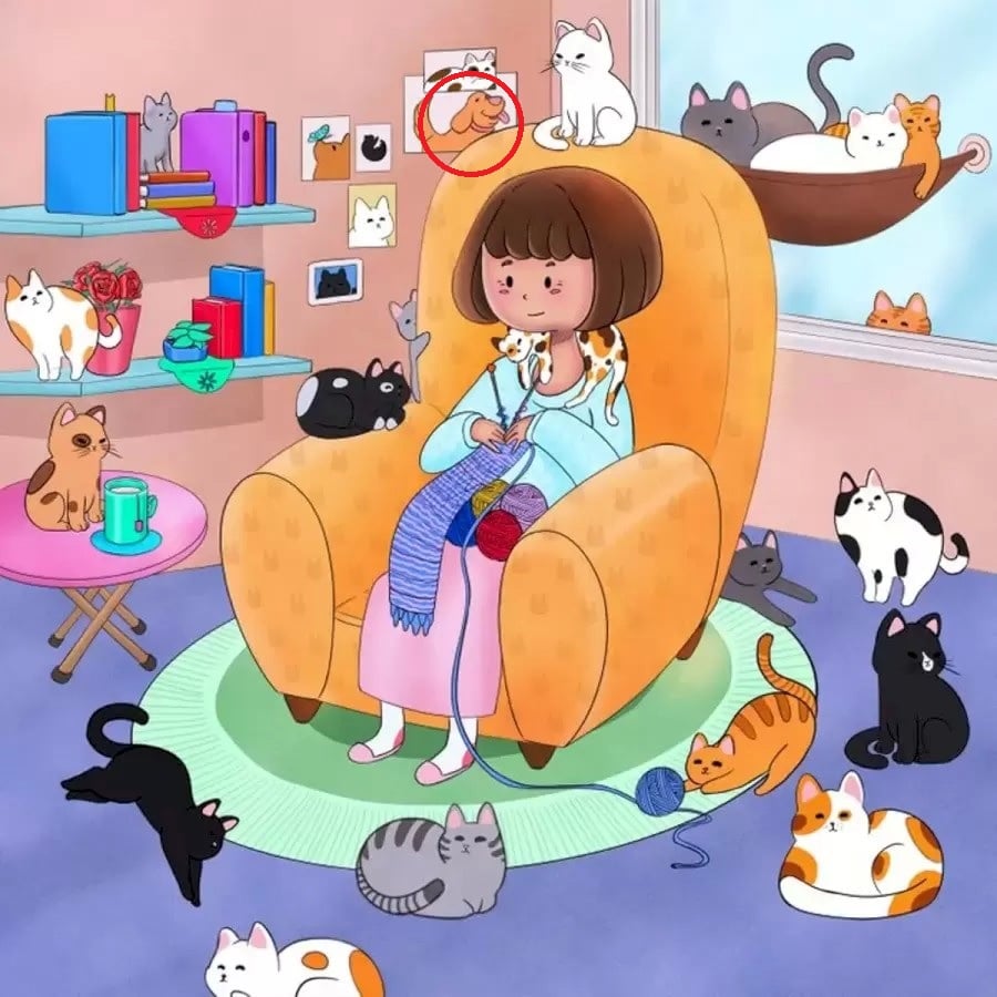 Представете си, че сте в уютна стая, където млада дама спокойно плете на стол. Около нея цяло царство от пухкави котки – някоя спи на пода, друга си играе с кълбо прежда, трета се е настанила на стола. Атмосферата е изцяло котешка. Но организаторите на тази визуална загадка са се погрижили да вмъкнат един неочакван гост. Вашата мисия е да преглътнете целия хаос от котки и да откриете единственото куче на картината. Готови ли сте да проверите вниманието и скоростта на възприятието си?