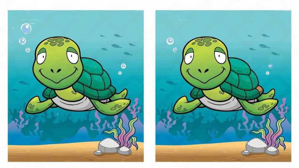 – Сравнявайте директно еднакви зони от двете картинки. Фокус върху контурите на костенурката, шарките по черупката и фона.