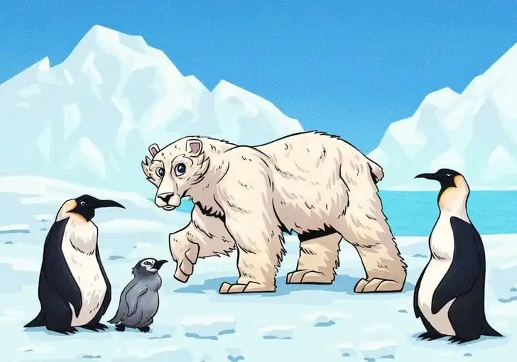Ако подсказките не са помогнали, ето и решението. Ключът е в разпределението на животните по полюсите на Земята. Белите мечки (Ursus maritimus) са ендемични за Арктика, тоест Северния полюс и околните региони. Пингвините обаче живеят изключително в Южното полукълбо, като мнозинството от видовете са концентрирани в Антарктика и субантарктическите острови. На Северния полюс няма пингвини в дивата природа. Следователно, сцена, в която тези две групи животни са заедно на леден пейзаж, е географска невъзможност. Това е концептуалната грешка в рисунката.
