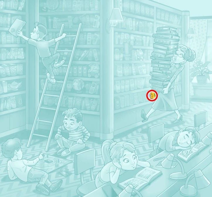 Този пъзел е истинско предизвикателство за вниманието: в хаотична сцена от библиотека, сред стотици книги и заети хора, се крие една електрическа крушка. Ключът към решението не е да гледаш навсякъде, а да знаеш къде да търсиш — понякога най-очевидното място е най-добре скрито.