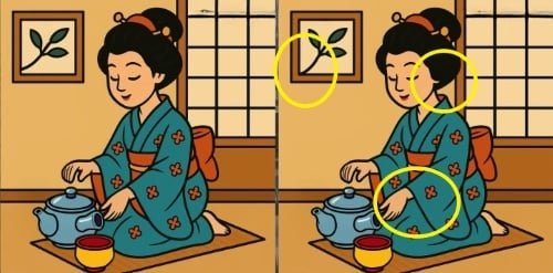 Предстои ви класически тест за внимателност и бързо възприемане: две на пръв поглед еднакви картини с жена, пиеща чай, крият три малки разлики. Вашата задача е да ги откриете за по-малко от 33 секунди. Ключът е в системно сканиране и фокус върху детайлите около лицето и предметите.