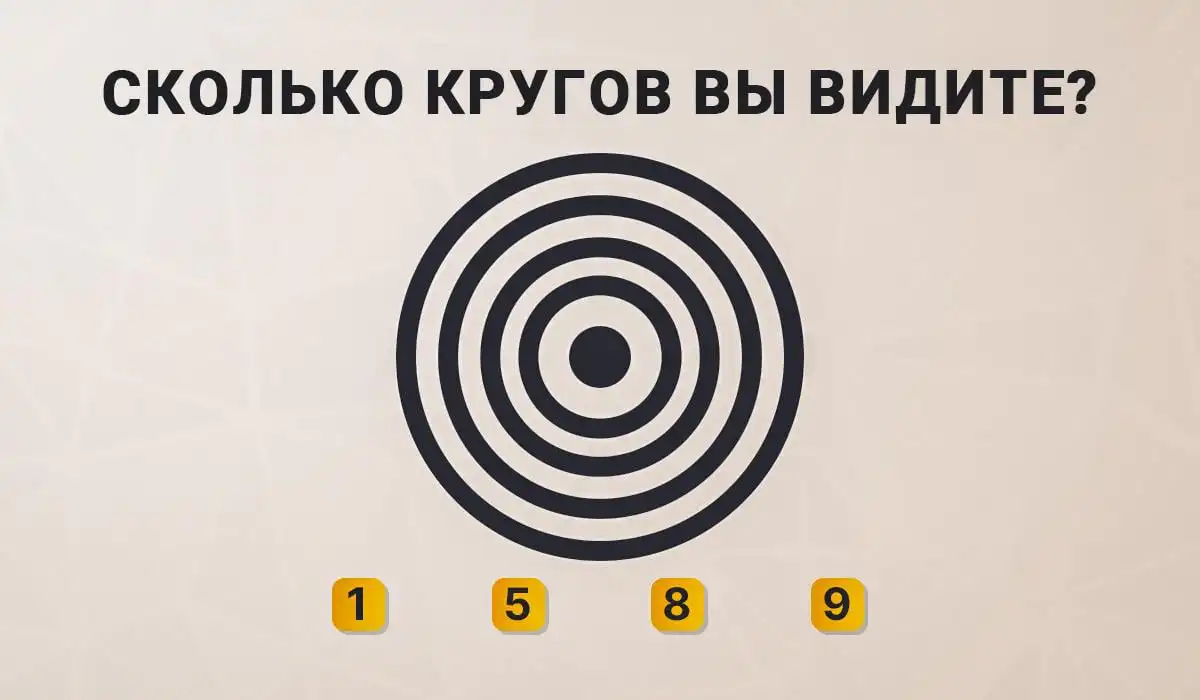 Четири големи черни + четири бели вътрешни + един централен черен = девет кръга. Много хора бързат и броят само големите черни кръгове или пропускат централния, което води до грешен отговор.