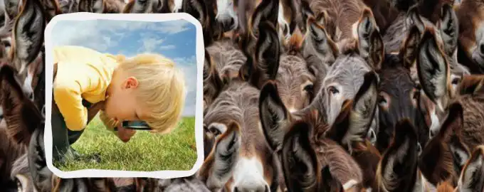 Това е класическа оптична илюзия, която проверява вниманието и способността да се разграничат детайли. Сред множеството магарета е скрит един вол.