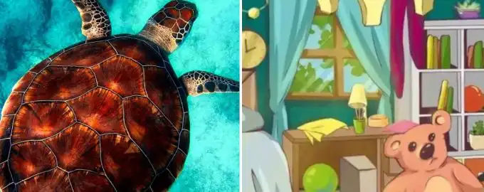 Това е класически тест за внимание и зрително възприятие: в хаотичната сцена на една спалня е скрита малка костенурка, която се слива с обстановката.