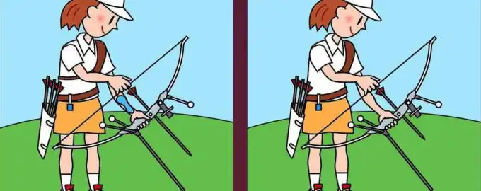 Това е класически тест за внимателност и бързина: две на пръв поглед еднакви илюстрации на момиче стрелец крият три малки, но съществени разлики.