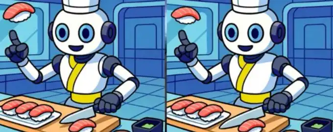 Този пъзел „Намери разликите“ тества окото и мозъка ви с една снимка на робот за суши. Двете картинки изглеждат идентични, но три детайла са променени.