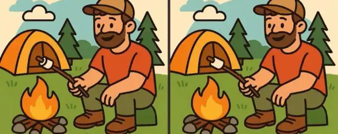 Този класически визуален тест „Намери разликите“ проверява вниманието ви до крайности. Две снимки на мъж, печещ маршмелоу, изглеждат идентични